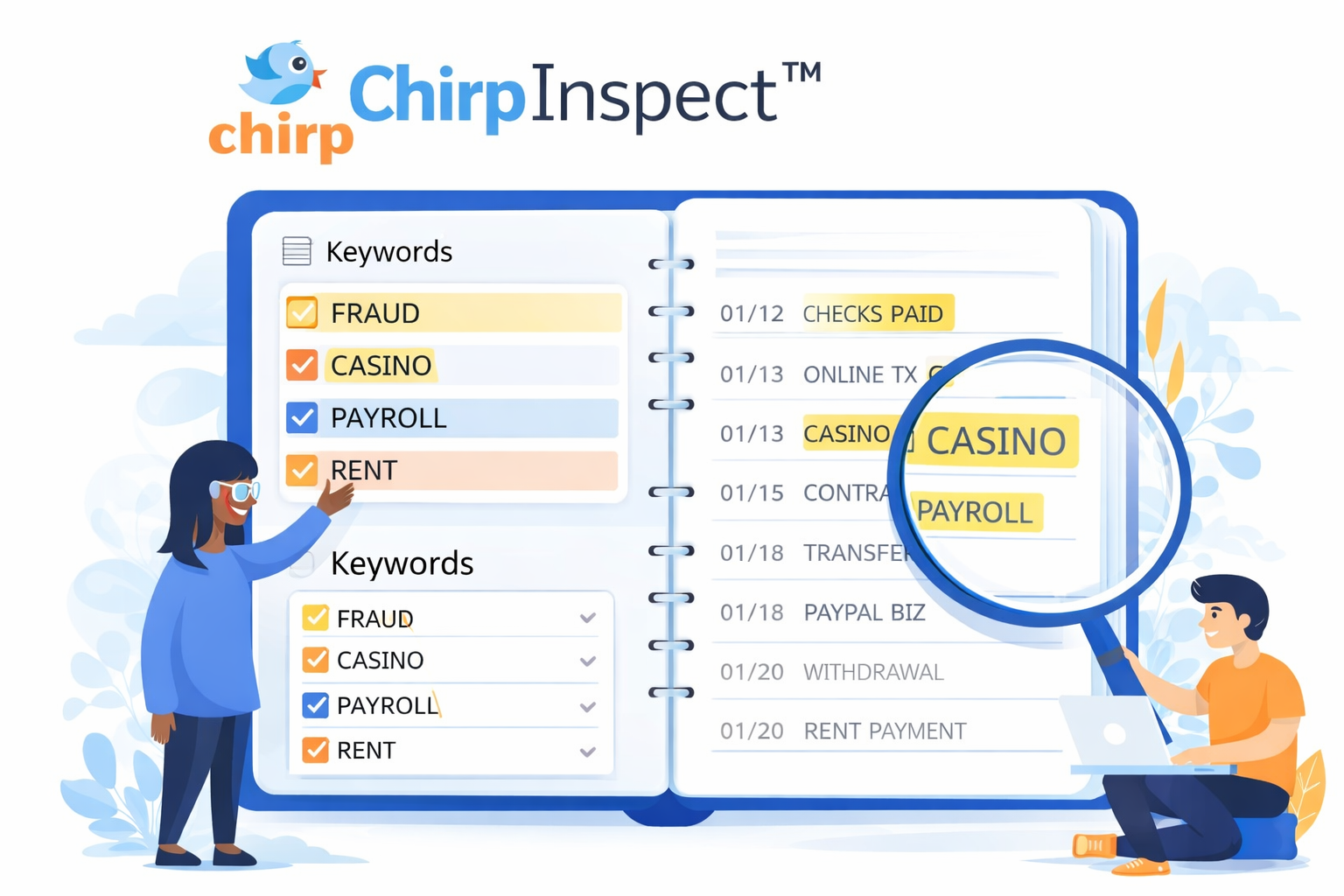 ChirpInspect™ empowers financial teams to quickly identify and surface specific keywords within transaction descriptions. Designed for streamlined review workflows, ChirpInspect™ enables clients to search, categorize, and highlight transactions based on custom-defined word sets making manual analysis faster and more precise.